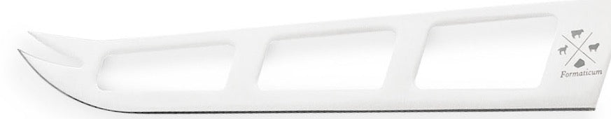 Formaticum professional cheese knives are the highest quality cheese tools. These knives are handmade in Italy and feature stainless steel blades and black polyethelene handles. The offset handle design makes it easy to use, resulting in clean, professional cuts every time. This blade is designed as a soft cheese knife and will easily cut all soft cheeses. The void on the blade helps prevent sticking. Use the forklet to serve. Formaticum professional cheese knives should always be hand-washed.