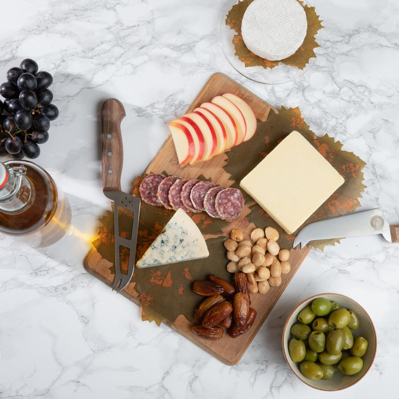 Use these grape leaves to make your cheese or charcuterie board beautiful. These Cheese Board Liners are manufactured in France on wax-coated parchment paper and printed with soy-based inks to make them food safe and biodegradable. The wax coating prevents the leaves from absorbing grease and allows for reuse after gently wiping clean.