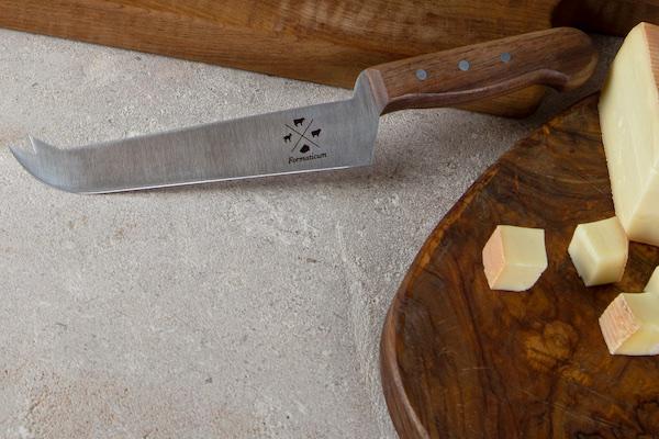 Formaticum professional cheese knives are the highest quality cheese tools. These knives are handmade in Italy and feature stainless steel blades and black polyethylene handles. The offset handle design makes them easy to use, resulting in clean, professional cuts every time. This is a general cheese knife with a tasting fork at the tip. Cut all types of cheese and then easily share tastes with friends. Formaticum professional cheese knives should always be hand-washed.